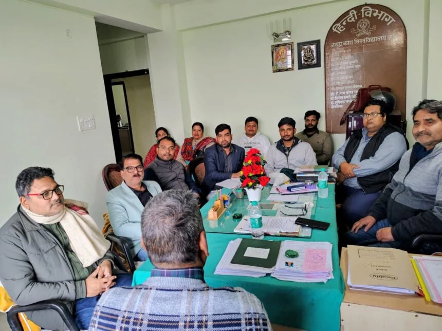 छपरा सदर। बुधवार को जे पी यू के स्नातकोत्तर हिंदी विभाग में एक बैठक विभागाध्यक्ष डॉ सिद्धार्थ शंकर की अध्यक्षता में हुई जिसमें हिन्दी पत्रकारिता के 200 वर्ष पूरा होने पर दो दिवसीय राष्ट्रीय संगोष्ठी के आयोजन को लेकर विस्तृत की चर्चा की गई।इस अवसर पर मुख्य रूप से प्रो० डॉ० सिद्धार्थ शंकर, डॉ० अजय कुमार,डॉ० चन्दन कुमार श्रीवास्तव,डॉ प्रियंका कुमारी,डॉ० अविनाश भारती,डॉ मजहर किब्रिया, डॉ विद्या भूषण श्रीवास्तव,डॉ० अजीत नारायण ,विद्यार्थी एवं शोधार्थी गण उपस्थित थे।