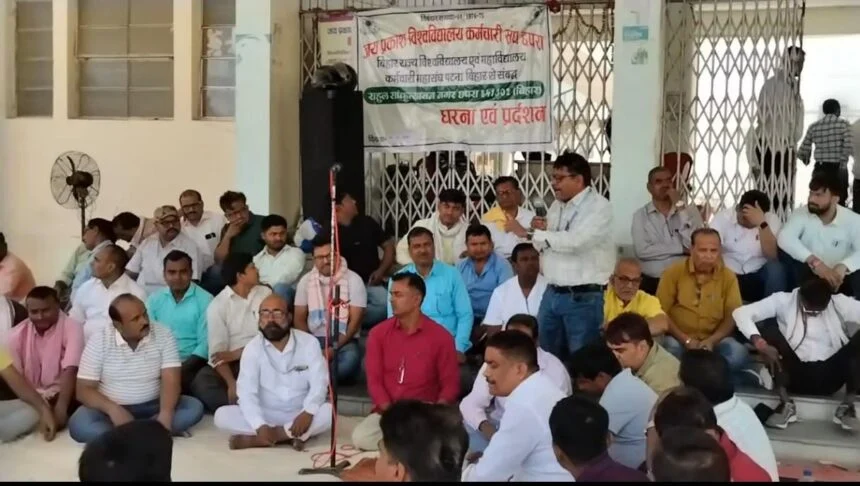 छपरा:जय प्रकाश विश्वविद्यालय कर्मचारी संघ ने अपनी मांगों को लेकर संघ के अध्यक्ष मुकेश तिवारी की अध्यक्षता में एक दिवसीय धरना दिया ।