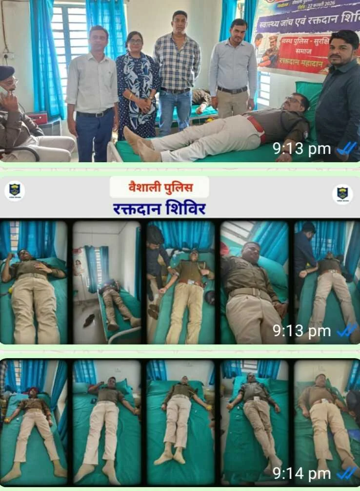 डॉ० संजय (हाजीपुर)- बिहार पुलिस सप्ताह–2026 के अवसर पर 22 फरवरी 2026 को पुलिस केंद्र, हाजीपुर में स्वास्थ्य जांच एवं रक्तदान शिविर का सफलतापूर्वक आयोजन किया गया। उक्त शिविर में जिले के पुलिस पदाधिकारी, पुलिस कर्मी, प्रशिक्षु एवं पुलिस उपाधीक्षक (रक्षित) सहित अन्य अधिकारियों,कर्मियों द्वारा उत्साहपूर्वक सहभागिता करते हुए रक्तदान किया गया।