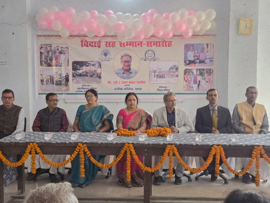 छपरा ।शनिवार को राजेंद्र कॉलेज में प्राचार्य प्रो. उदय शंकर पाण्डेय के सम्मान में भव्य विदाई सह सम्मान समारोह का आयोजन किया गया। कार्यक्रम का वातावरण अत्यंत भावनात्मक एवं गरिमामय रहा, जिसमें शिक्षकों, कर्मचारियों एवं विद्यार्थियों की उल्लेखनीय उपस्थिति रही ।कार्यक्रम की अध्यक्षता प्रो. अशोक कुमार सिन्हा ने की। कार्यक्रम का प्रारंभ दीप प्रज्वलन के साथ हुआ। इसमें मंगलाचरण श्री हरेराम शास्त्री द्वारा प्रस्तुत किया गया। अपने अध्यक्षीय संबोधन में उन्होंने प्रो. उदय शंकर पाण्डेय के सफल कार्यकाल, उनके कुशल नेतृत्व, शैक्षणिक उत्कृष्टता एवं संस्थान के विकास में दिए गए अमूल्य योगदान की सराहना की।