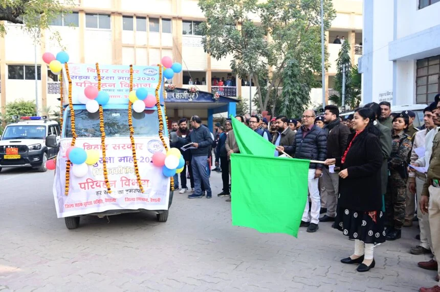 ———————————————————— —————डॉ० संजय (हाजीपुर)-जिला पदाधिकारी, वैशाली, वर्षा सिंह द्वारा सड़क हादसों में कमी लाने एवं आमजन को यातायात नियमों के प्रति जागरूक करने के उद्देश्य से सड़क सुरक्षा माह 2026 के तहत मंगलवार को समाहरणालय परिसर, हाजीपुर से सड़क सुरक्षा जागरूकता रथ को हरी झंडी दिखाकर रवाना किया गया। जिला पदाधिकारी ,वैशाली , वर्षा सिंह ने इस अवसर पर उपस्थित पदाधिकारियों, कर्मियों एवं आमलोगों को सड़क सुरक्षा की शपथ दिलाई और यातायात नियमों के पालन का संदेश दिया।